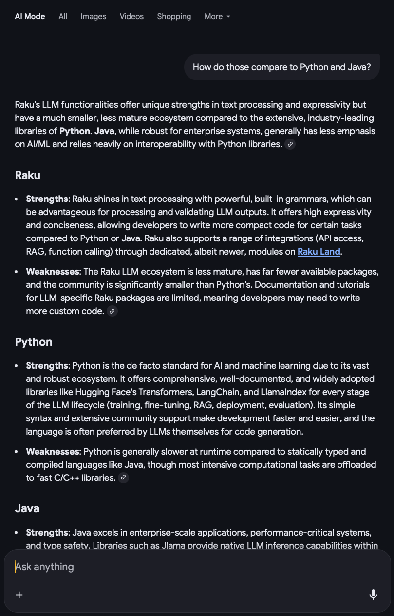| <librasteve> hmm ChatGPT says that Raku LLM lacks the maturity of Pythin, Rust, JS options chatgpt.com/share/69401996-13e8-80...d9b9c433ae ... do you have ink or text to Google opinion ? | 14:23 | ||