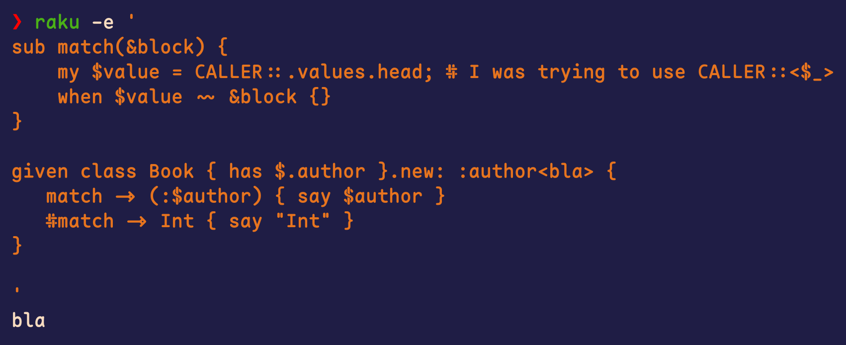 SmokeMachine m: my $book = class Book { has $.author }.new: :author<bla>; given $book -> $b (:$author) { say $author } 12:19