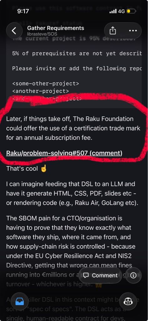 | disbot8 | <librasteve> SmokeMachine: are you talking about the SOS idea? if so, please share your concerns in that issue. fwiw any and all code developed by the community should be free under the Artistic 2.0 | 20:53 | |